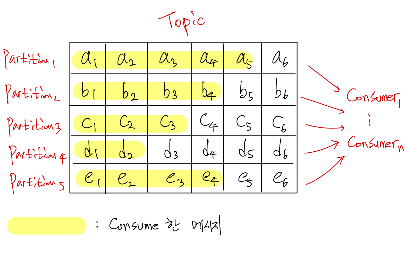 위 그림에서 하나의 토픽에는 여러 개의 파티션이 존재하며, 컨슈머는 각 파티션에 대해 자신이 처리한 메시지의 위치를 Offset으로 기록합니다. 즉, 파티션 1~5의 Offset은 5, 4, 3, 2, 4가 되겠죠.