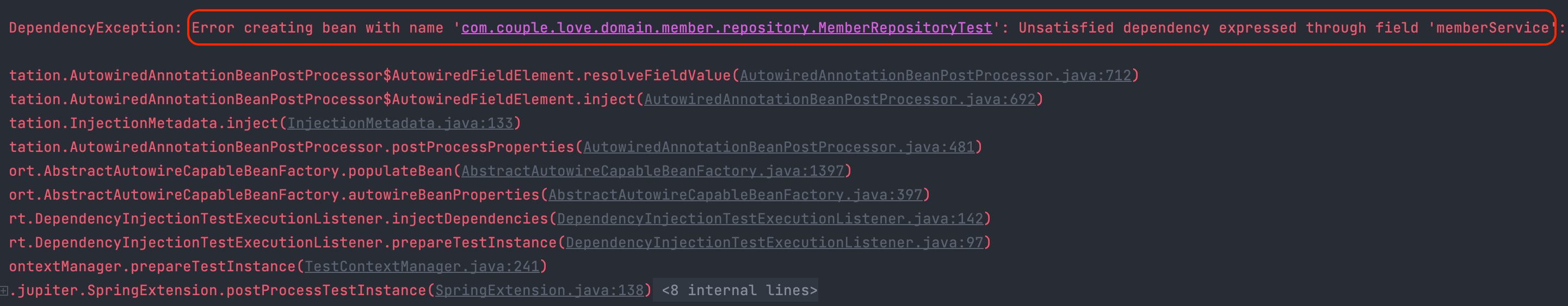 따라서 아래와 같이 @DataJpaTest에서 @Service와 같은 어노테이션을 통해 Bean으로 등록된 클래스를 주입하려고 하면 아래와 같은 에러를 만나게 됩니다.