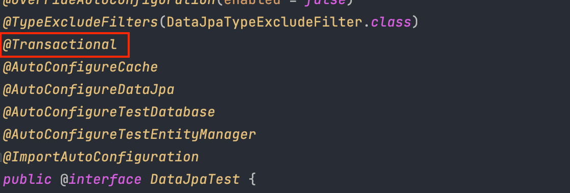 그리고 @DataJpaTest는 @Transactional을 포함하므로 따로 @Transactional 어노테이션을 추가하지 않아도 각 테스트는 마지막에 롤백됩니다.