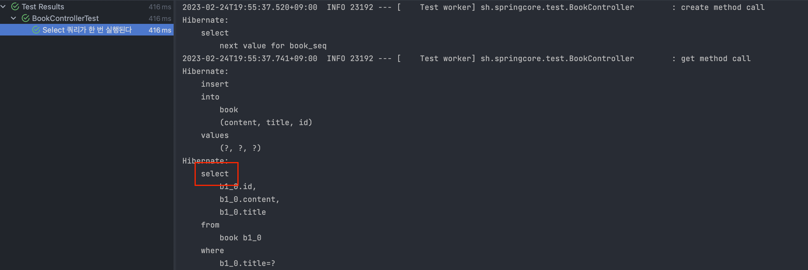 이제 아래와 같이 테스트 코드를 작성해서 캐시를 잘 사용하고 있는지 쿼리를 확인해보겠습니다.