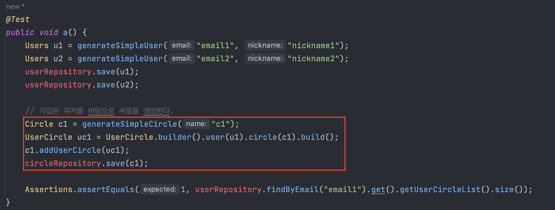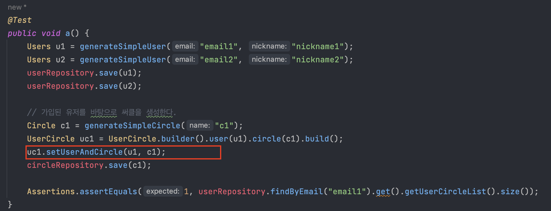 이 테스트 코드가 성공하기 위해서는 u1.addUserCircle(uc1); 이라는 메서드를 추가로 호출했어야 합니다.