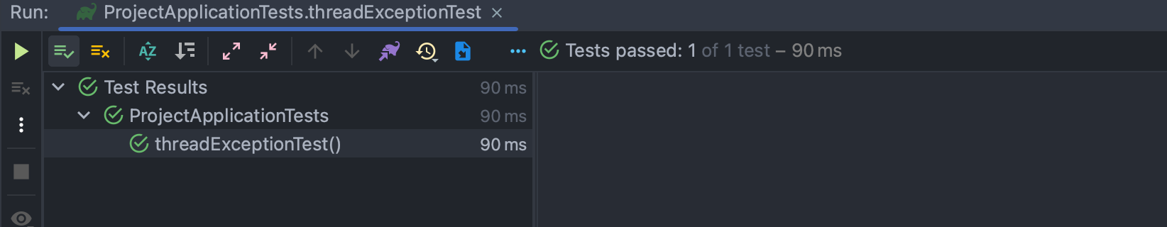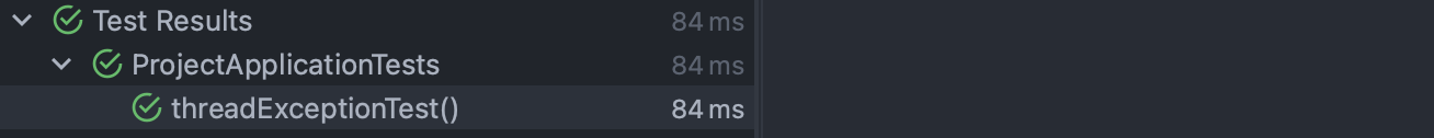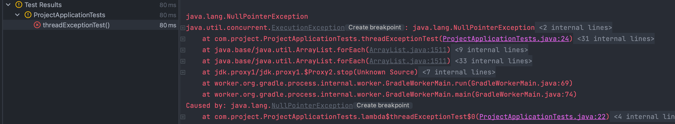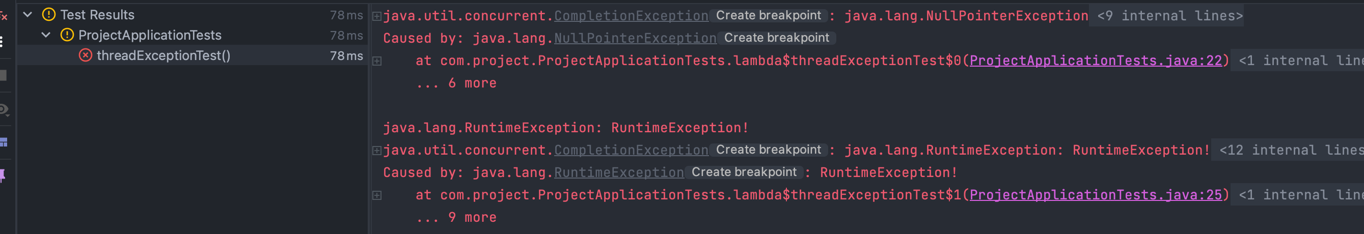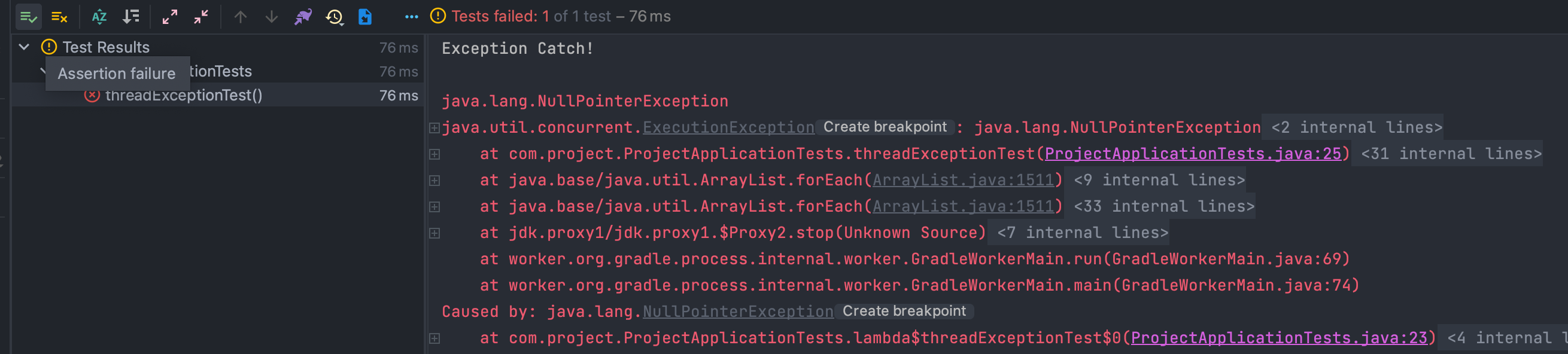 그래서 결과적으로는 메인 쓰레드에서 예외가 발생하여 테스트 코드가 실패하는 것을 알 수 있습니다.