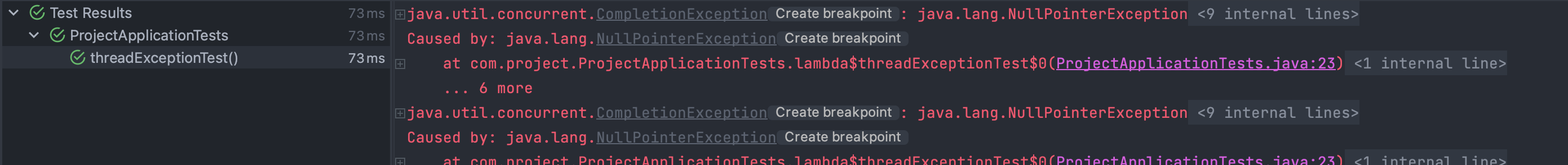 위 테스트 코드는 각 쓰레드에서 NullPointerException을 의도적으로 발생시키고, 별도의 try-catch 블록을 사용하지도 않습니다.