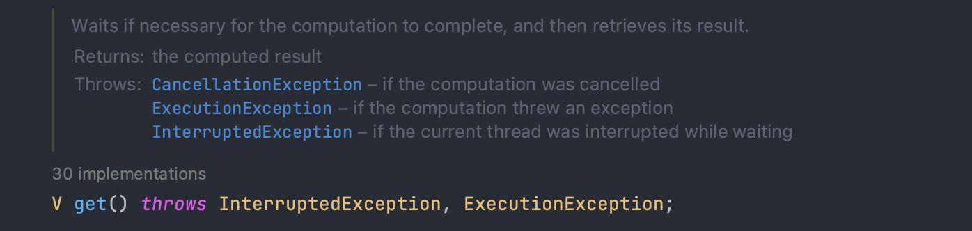 연산의 결과에서 예외가 발생한다면(if the computation threw an exception) ExecutionException을 발생시키게 됩니다.