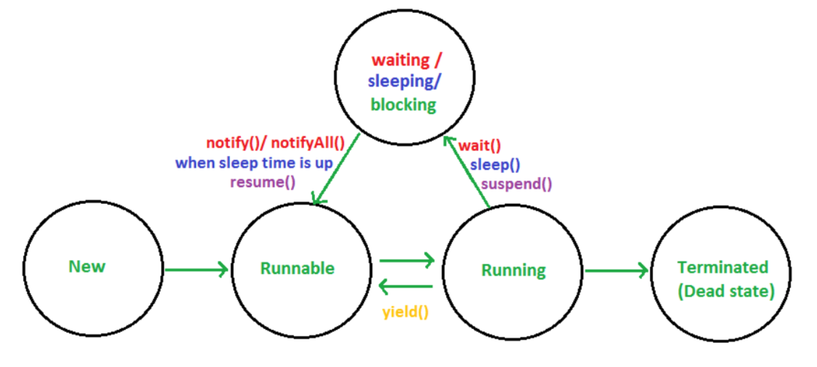 - Running 상태에서 쓰레드가 모두 실행되고 난 후 완료 상태로, run() 메소드 완료시 쓰레드가 종료되며, 그 쓰레드는 다시 시작할 수 없게 됩니다.