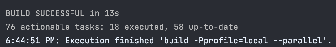예를 들어, 전체 프로젝트를 빌드할 때 --parallel 옵션 없이 빌드를 수행하면 33초 정도 걸리는 반면 --parallel 옵션을 사용했을 시 여러 Task 들이 병렬로 처리되어 13초 안에 모든 빌드가 끝나는 것을 볼 수 있습니다.