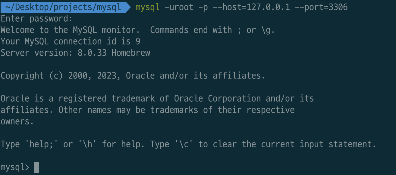 $ mysql -uroot -p --host=127.0.0.1 --port=3306