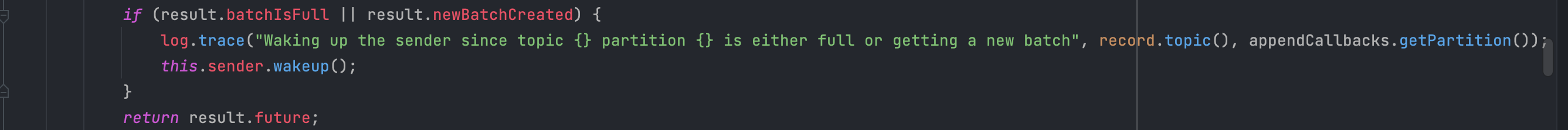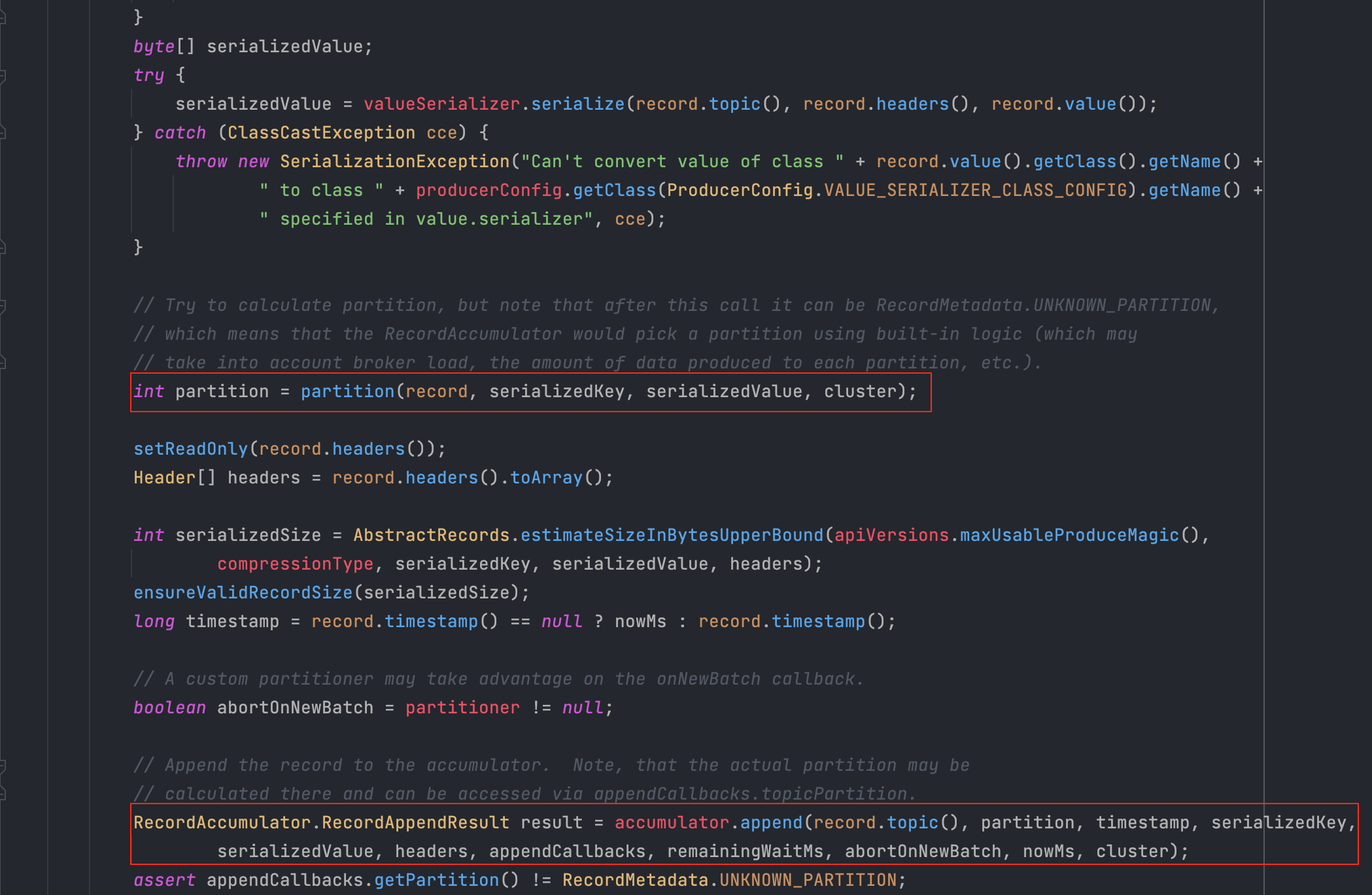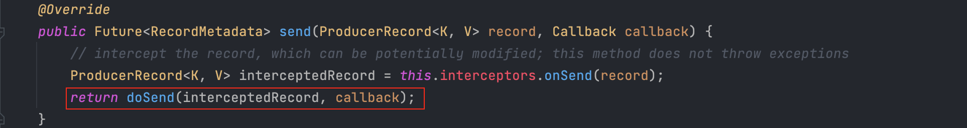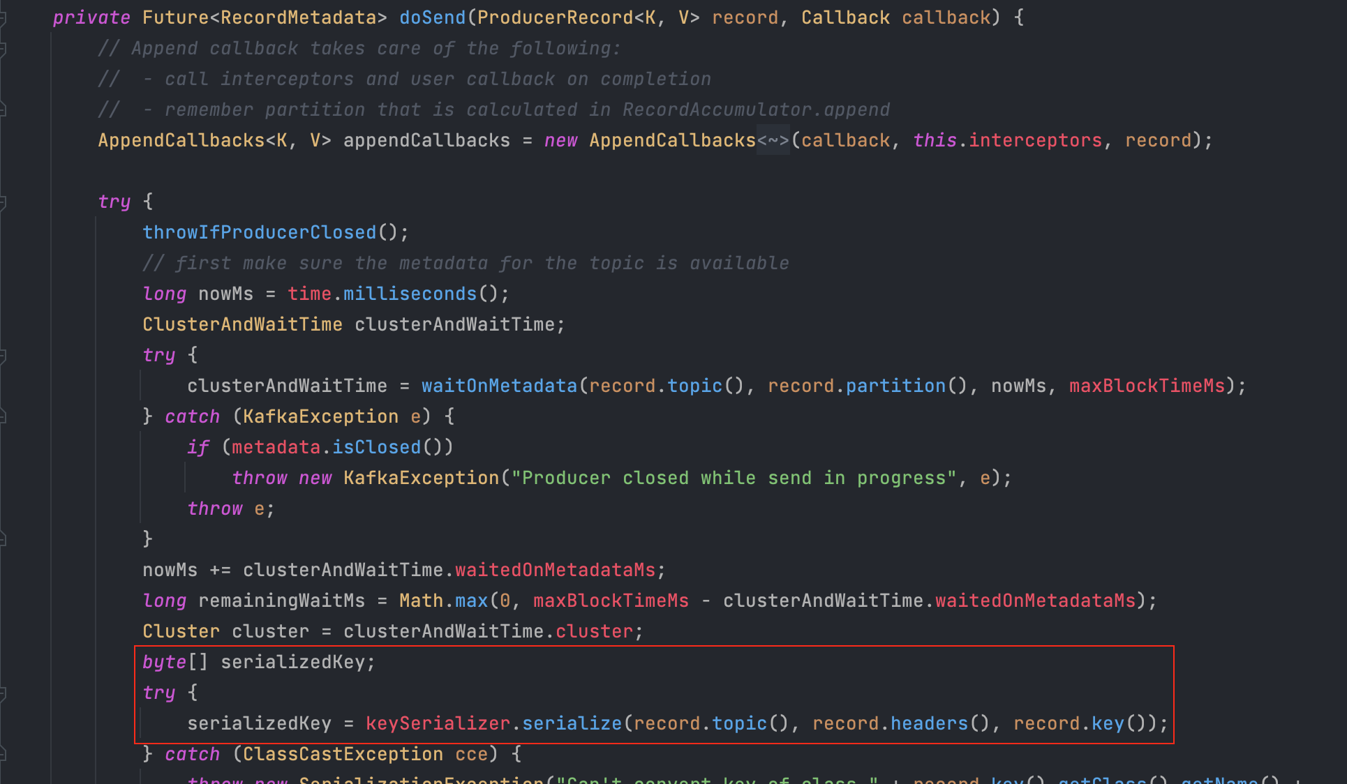 지금까지 설명한 내용이 모두 KafkaProducer.java의 doSend(ProducerRecord<K,V> record, Callback callback) 메서드에 포함되어 있으니, 궁금하신 분들은 소스 코드를 한 번 봐보시는 것을 추천드립니다(별로 길지 않습니다).