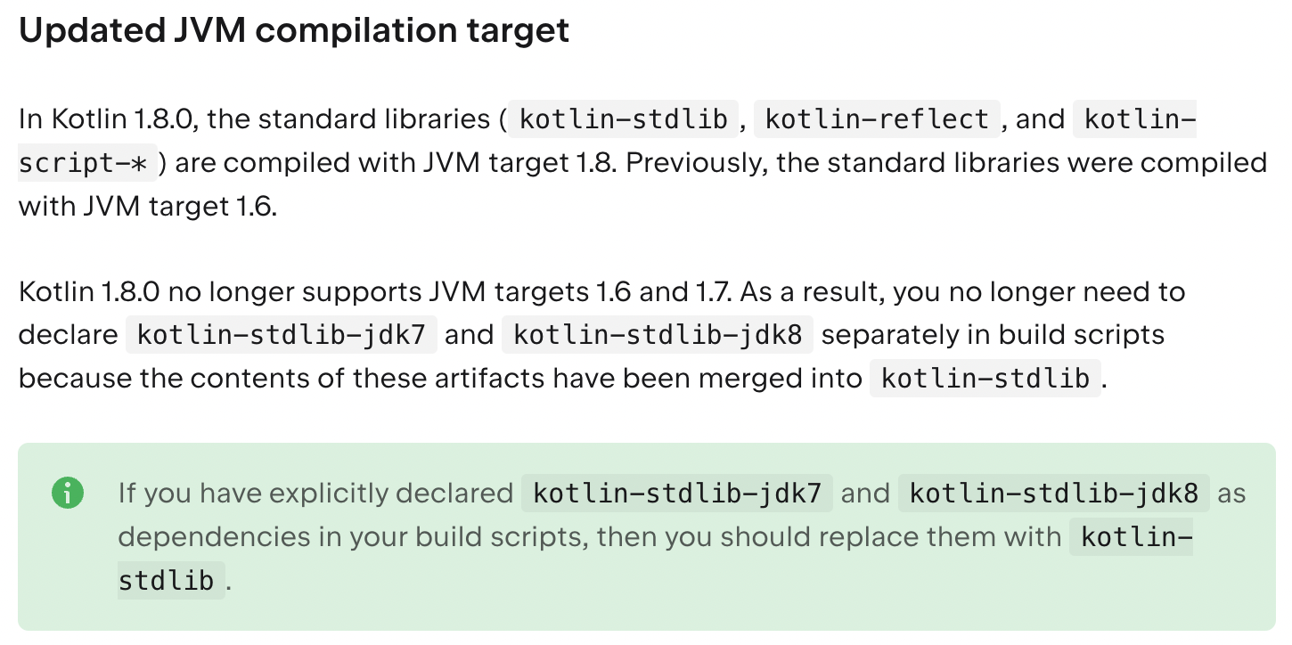 다만, 코틀린 공식 문서에서 설명하듯 Kotlin 1.8.0 버전부터는 kotlin-stdlib-jdk* 의존성이 kotlin-stdlib에 통합되었기 때문에 kotlin-stdlib-jdk*의존성을 추가해서 사용 중이었다면 kotlin-stdlib로 대체하라고 말합니다.