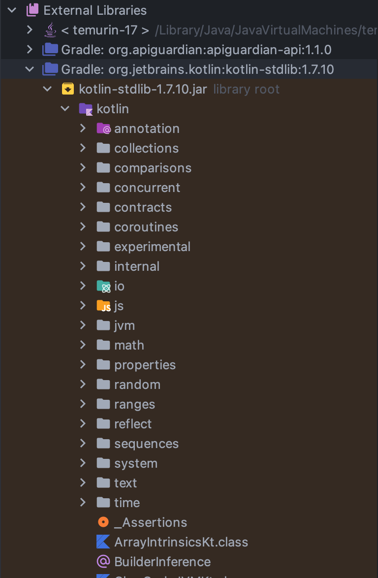 실제로 build.gradle.kts 파일에 코틀린 stdlib 의존성을 추가해보면 코틀린에서 기본적으로 제공하는 여러 기능들이 추가되는 것을 볼 수 있습니다.