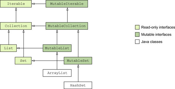 어떤 함수가 MutableCollection이 아닌 Collection 타입의 인자를 받는다면 그 함수는 컬렉션을 변경하지 않고 읽기만 해야 합니다. 반면, 어떤 함수가 MutableCollection을 인자로 받는다면 그 함수가 컬렉션의 데이터를 바꾸리라 가정할 수 있죠.