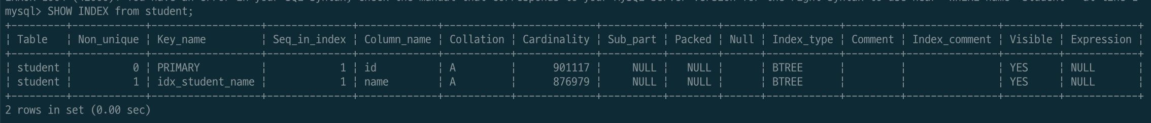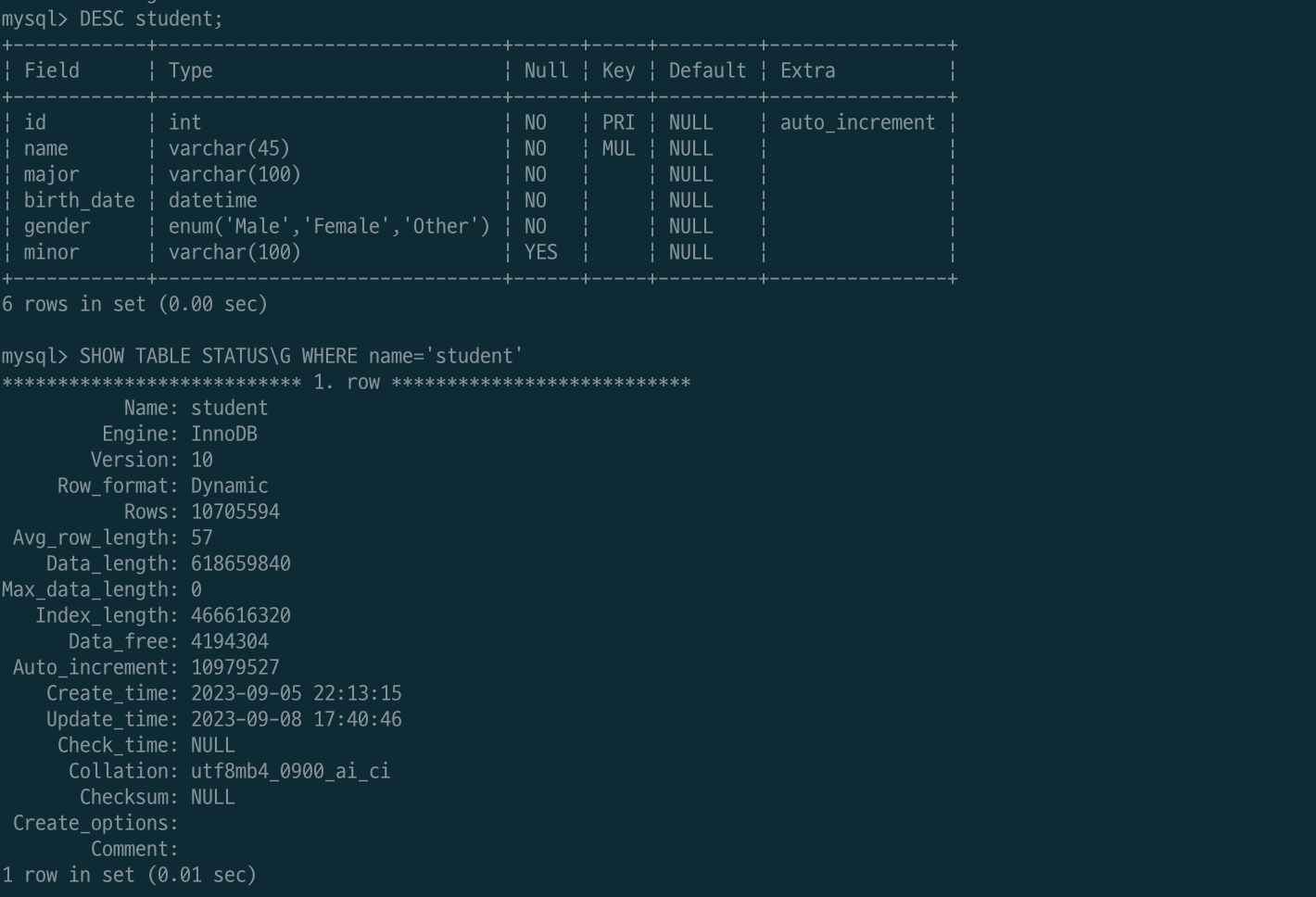 아래는 예제로 생성한 student 테이블입니다. 약 1,000만 개의 row가 있고 id 컬럼이 PK이며 name 컬럼이 인덱스로 설정되어 있습니다.