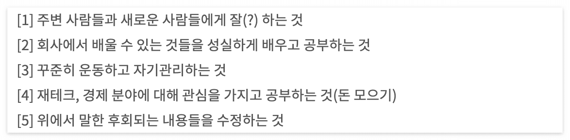일년동안 지켜야겠다고 생각한 습관들(저축, 운동, 개인 스터디, 블로그 등)은 지켰다. 더 기특한 삶도 있었겠지만, 최소한의 것들은 지켜왔으니 무승부는 되는 것 같다.