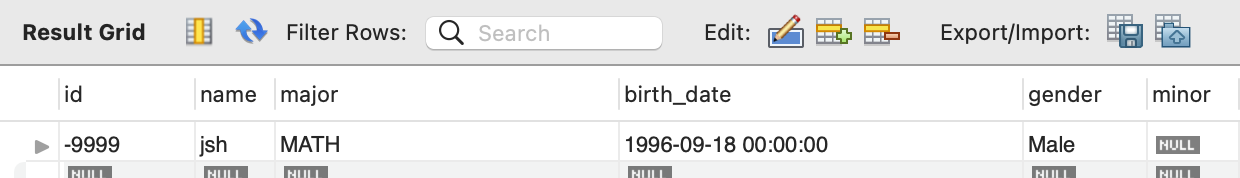 | START TRANSACTION; INSERT into test_db.student values (-9999, 'jsh', 'MATH' , '1996-09-18', 'Male', null); COMMIT ; |