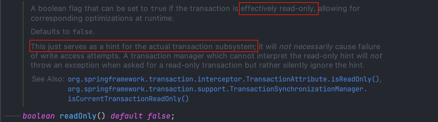 먼저 Transactional 인터페이스에 기재되어 있는 readOnly() 옵션에 대한 설명을 읽어보겠습니다.