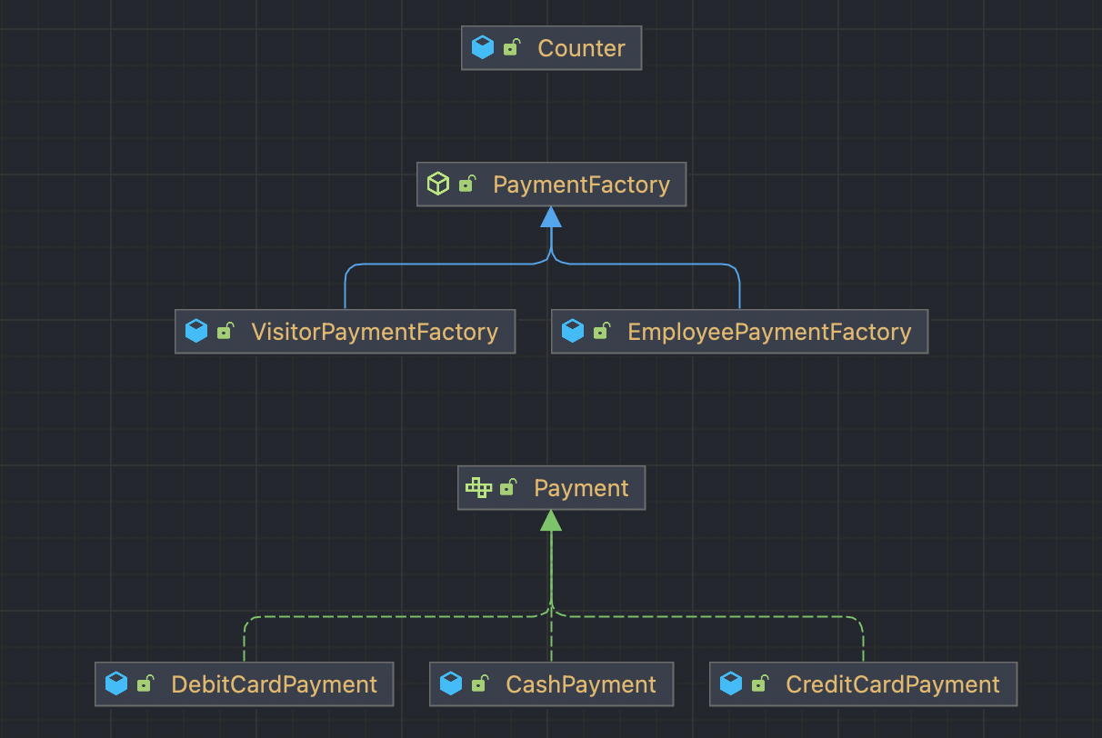 위 그림을 보면 Counter에서 결제 수단을 생성하는 책임을 PaymentFactory에 위임합니다.
