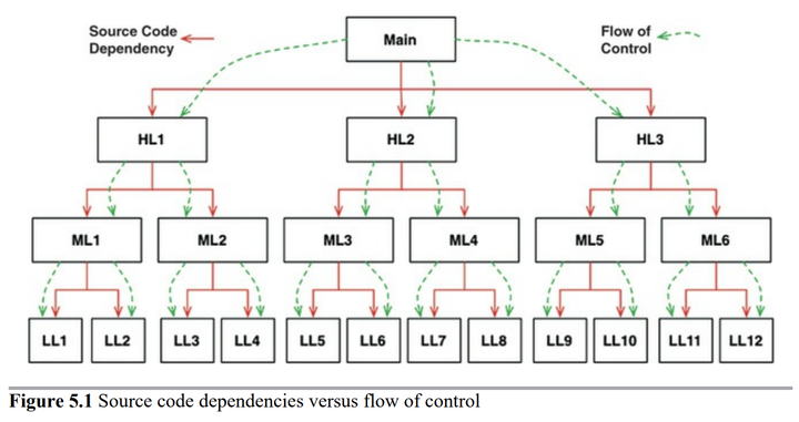 전형적인 호출 트리의 경우 main 함수가 고수준 함수를 호출하고, 고수준 함수는 다시 중간 수준 함수를 호출하며 중간 수준 함수는 다시 저수준 함수를 호출한다. 이러한 호출 트리에서 소스 코드 의존성의 방향은 반드시 제어흐름을 따르게 된다.