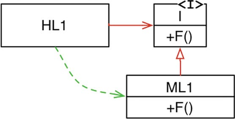 위 그림에서 HL1 모듈은 ML1 모듈의 F() 함수를 호출한다. 소스 코드에서는 HL1 모듈은 인터페이스를 통해 F() 함수를 호출한다. 이 인터페이스는 런타임에서는 존재하지 않는다. HL1은 단순히 ML1 모듈의 함수 F()를 호출할 뿐이다. 하지만 ML1과 I 인터페이스 사이의 소스 코드 의존성이 제어 흐름과는 반대인 점을 주목하자.