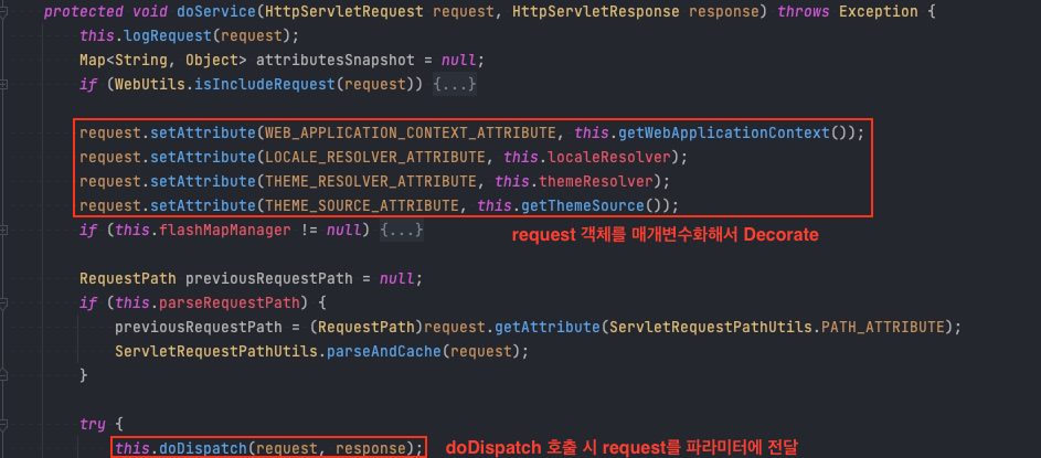 이 설명은 DispatcherServlet 클래스에서 아래와 같은 코드를 통해 구현됩니다.