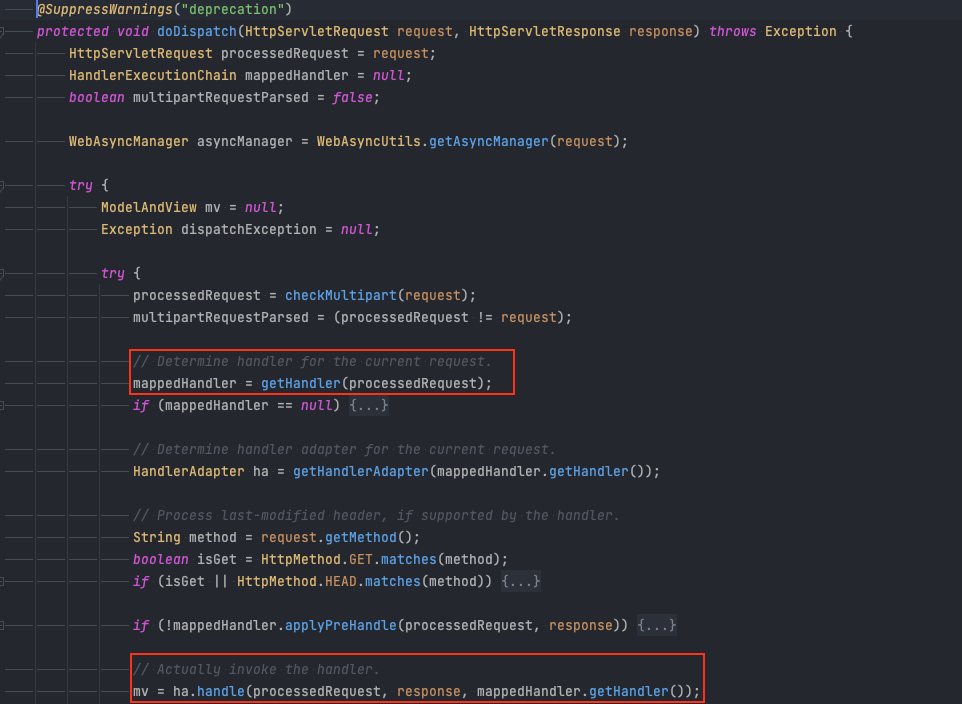 간략히 코드를 보면 DispatcherServlet은 mappedHandler에서 어떤 컨트롤러에서 처리되어야 하는지 결정할 HandlerAdapter를 가져오고, handle() 메서드를 통해 핸들러를 invoke() 합니다. invoker 역할을 하고 있죠.