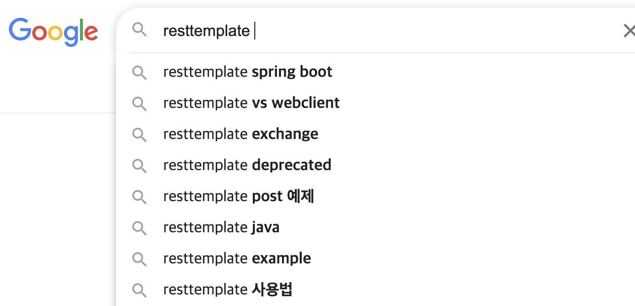 구글에 RestTemplate에 대해 검색해보면 아래와 같이 연관 검색어로 RestTemplate deprecated 라는 내용이 보입니다.