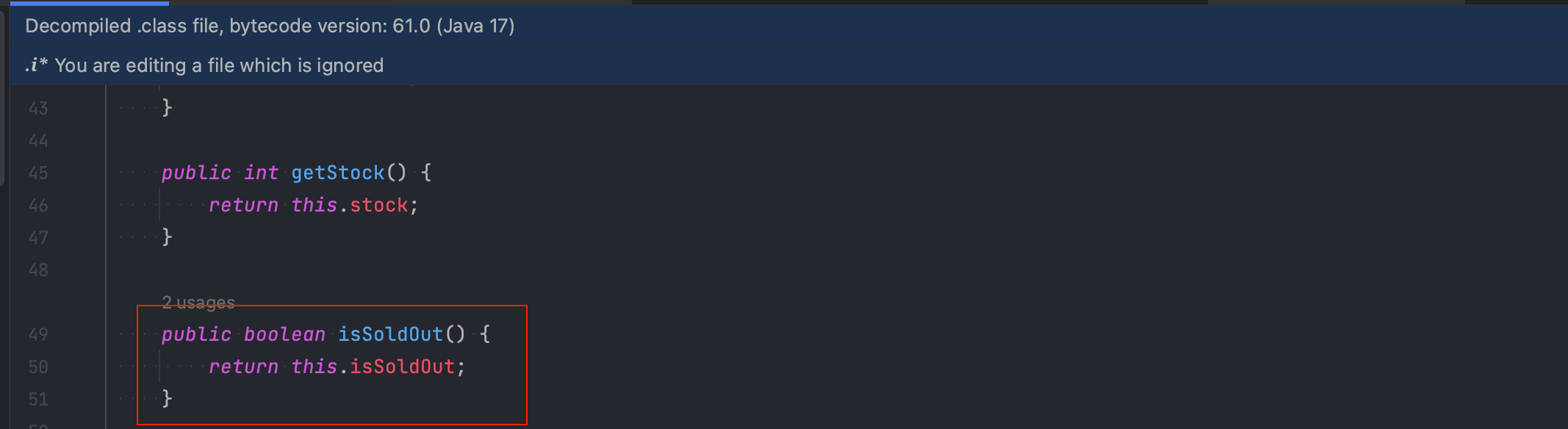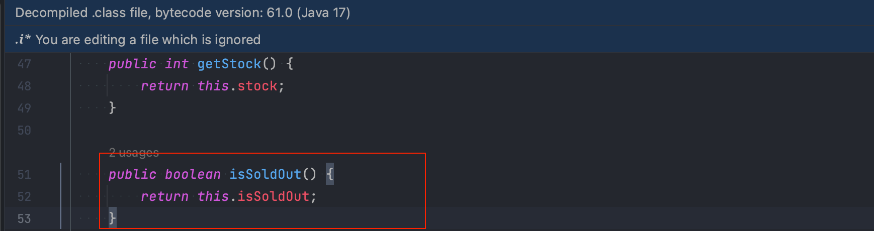빌드 이후에 .class 파일을 보면 isSoldOut 필드에 대한 Getter 메서드가 getIsSoldOut()이 아닌, isSoldOut() 자체로 정의된 것을 볼 수 있습니다.