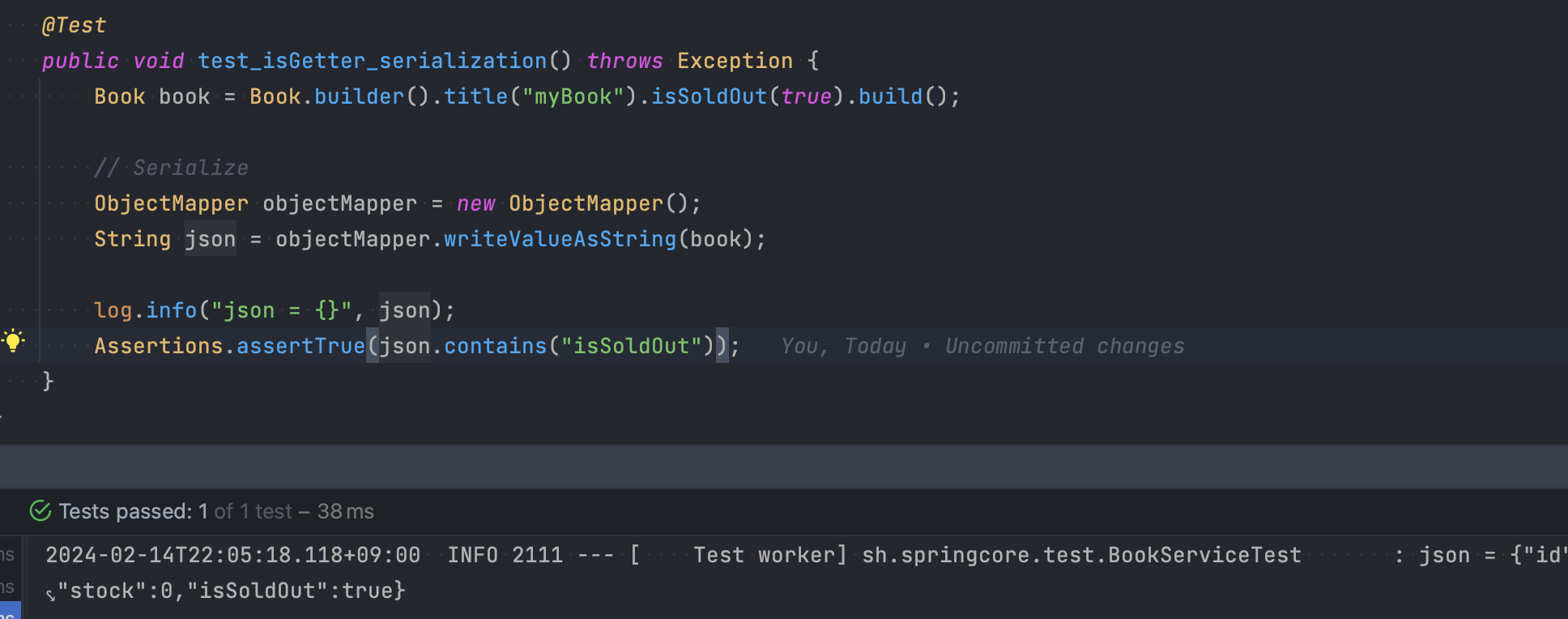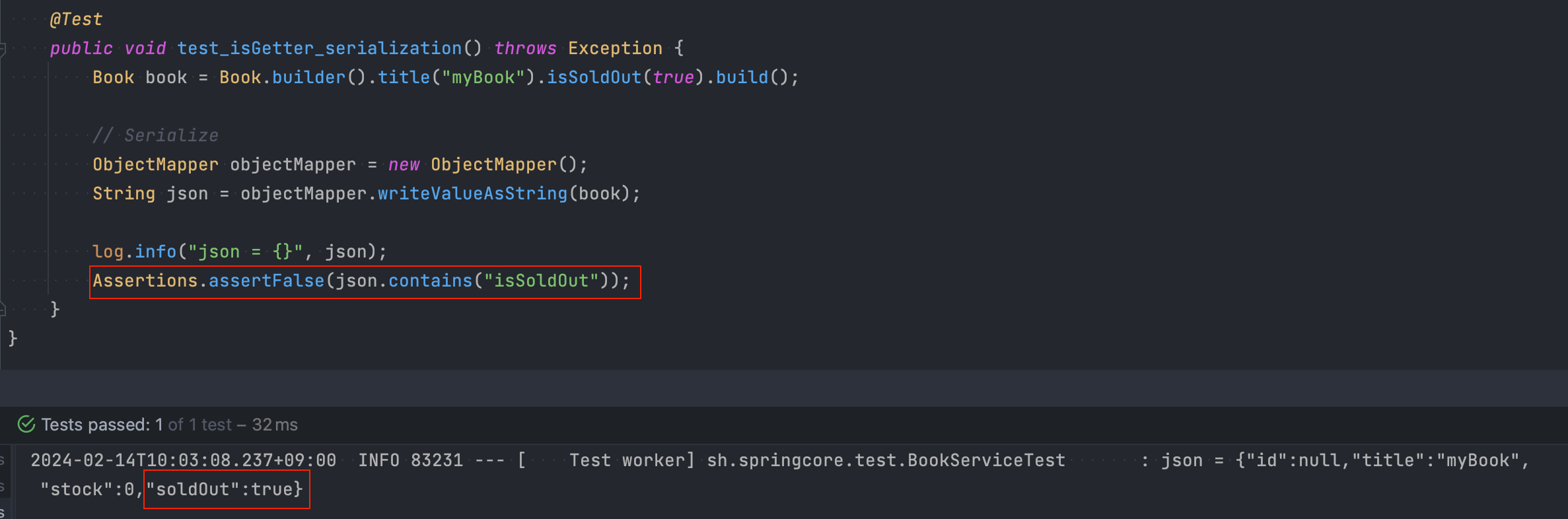위 테스트는 Book 클래스 자체를 Serialize 할 때 isSoldOut 필드가 어떻게 변환되는지 보여줍니다.