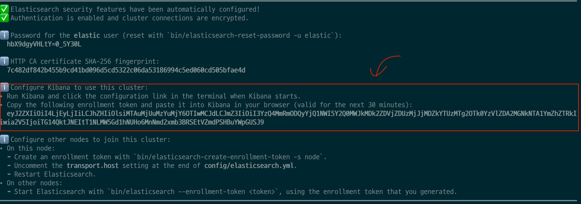 es를 실행했을 때 로그에 출력됐던 토큰을 입력해줍니다.