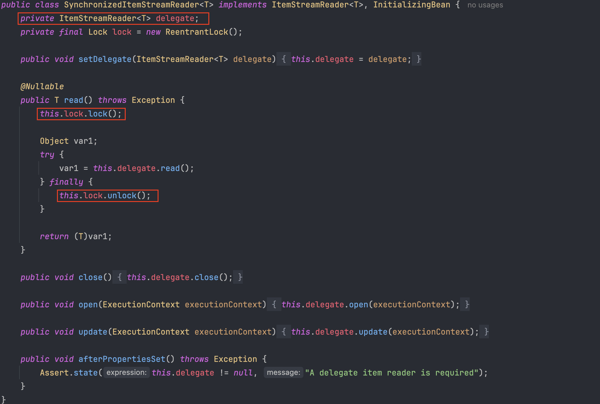 SynchronizedItemStreamReader는 ItemStreamReader의 구현체들을 delegate로 받아 실제 read() 수행을 위임한다.