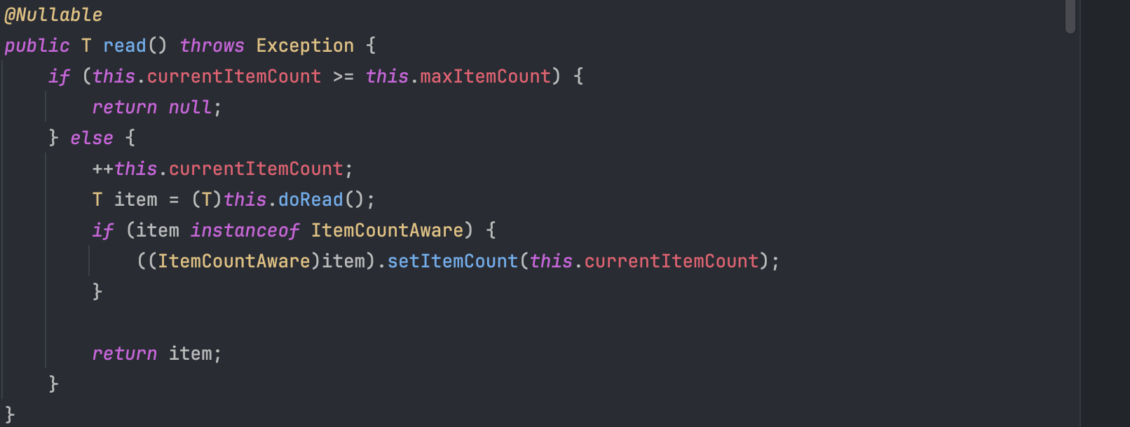 한편, read() 메서드에서는 currentItemCount를 확인하고 구현체의 doRead 메서드를 호출하게 된다.