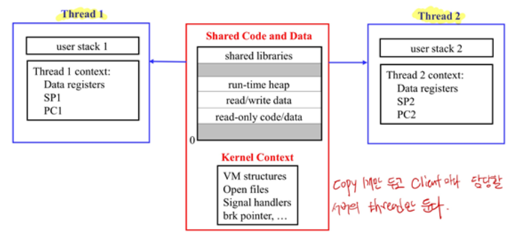 다시 말해서 공유 가능한 Shared libraries, Runtime heap, Read/Write Data, Read-only Code/Data 등과 Kernel Context는 하나로 떼어두고, 특정 시점의 Program Counter(PC)에 따라 스택 영역의 메모리가 달라지기 때문에 스택 영역은 각 쓰레드가 개별적으로 가지는 것이죠.