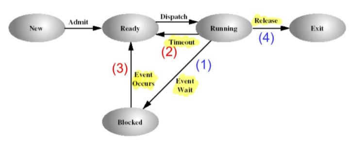 위 그림에서 (1), (4)에 의해서만 프로세스가 스위칭되는 것을 NonPreemptive라고 생각하면 되고 (1)~(4)에 의해 프로세스가 스위칭될 수 있는 것을 Preemptive라고 생각하시면 됩니다.