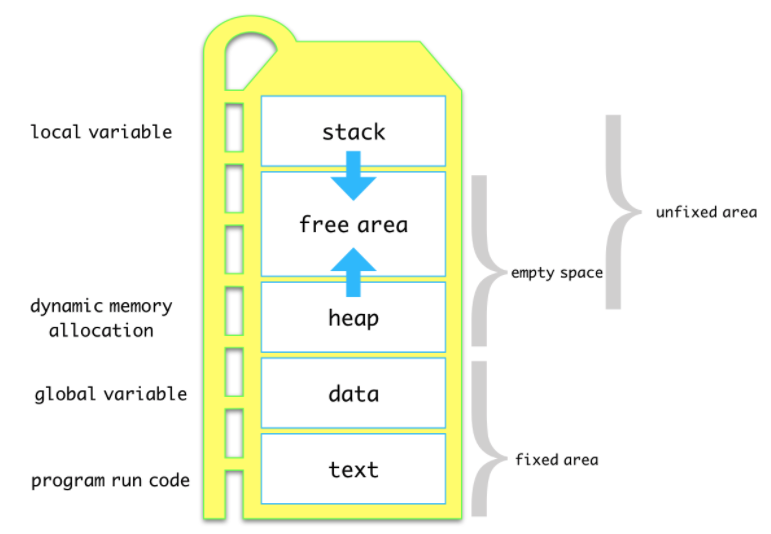 그리고 그 위에는 초기화해서 변하지 않는 변수를 저장하고, 다시 그 위에 아직 초기화하지 않은 전역 변수나 정적(static) 변수를 저장합니다. 이 두 부분을 엄밀히 구분할수도 있는데, 여기서는 Data 영역으로 표시되어 있습니다.