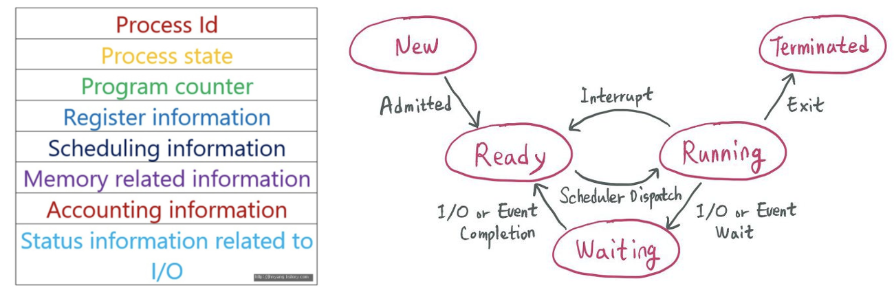 또한 Accounting information에는 프로세스를 처리하고 있는 CPU의 사용시간, 실제 사용된 시간 등이 담겨있으며 Status information related to I/O는 입출력 상태 정보를 가지고 있습니다. 프로세스에 할당된 입출력장치의 목록이나 열린 파일 목록 등을 저장하고 있죠.