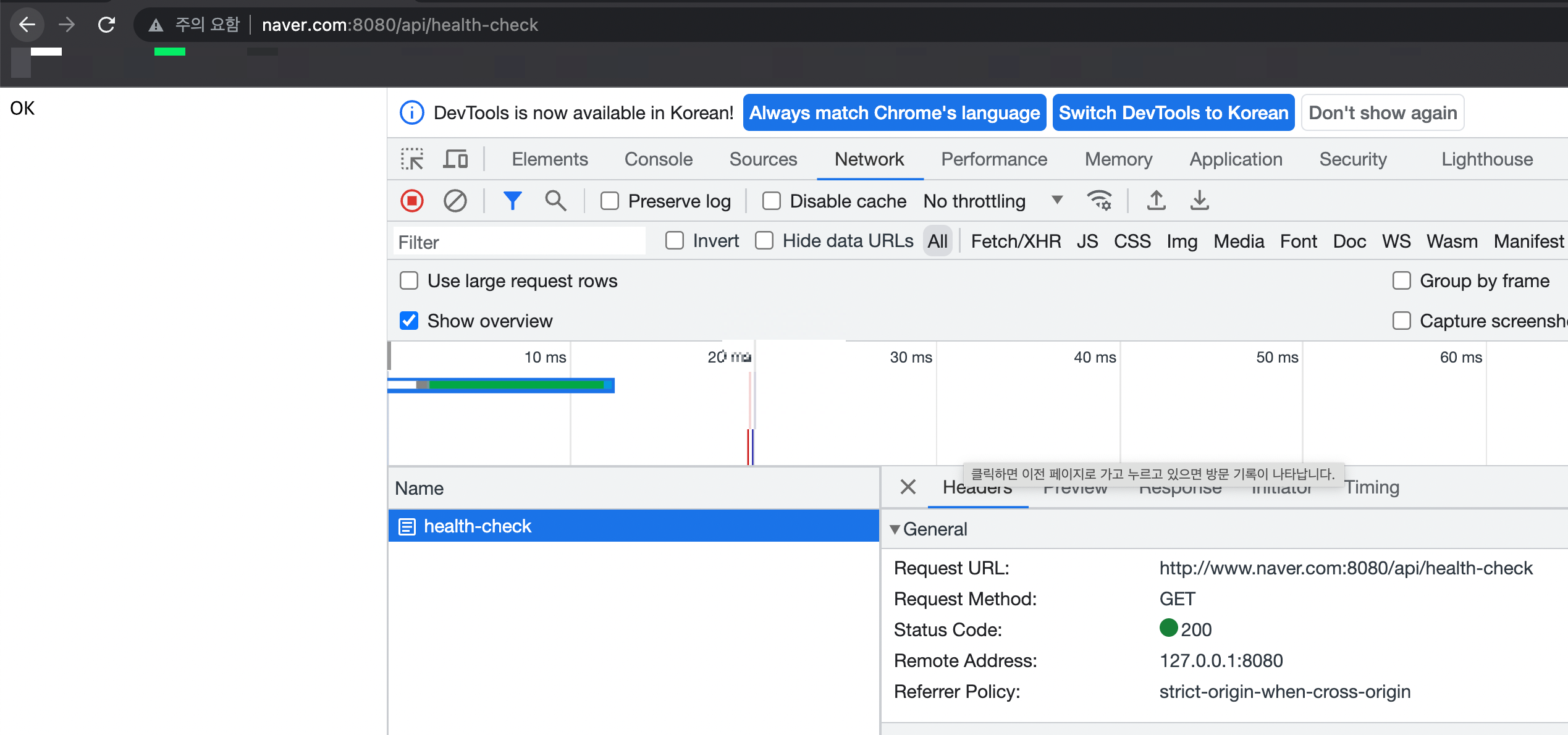 테스트 결과를 보면, www.naver.com 에 대한 요청이 실제로는 제가 실행한 Springboot 애플리케이션으로 향했고, OK 응답을 받은 것을 확인할 수 있습니다.